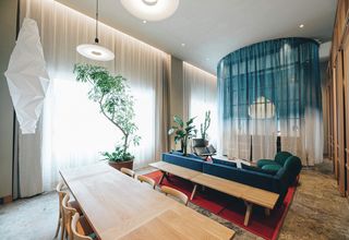 Gästrummens unika karaktär kännetecknas av en genomskinlig 4,5 m cylinder gjord av tyg som stiger från golvet upp till taket. Gardinskena SG 6103 bockad i en cirkel, som på ett fint sätt omsluter den fristående sängen. Det genomskinliga tyget, delvis färgat i indigo, är upplyst av en specialtillverkad rispapperslampa. Alla rummen har infällda gardinskenor, SG 6243. Skira gardiner för att skapa en ljus och skön atmosfär i rummet och ytterligare en gardin med kraftig textil för att kunna mörklägga vid behov.